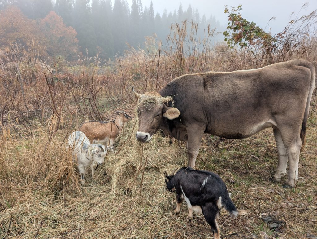 秋も深まり、食べられる牧草が少なくなってきました。乾草を朝晩運んでいます。